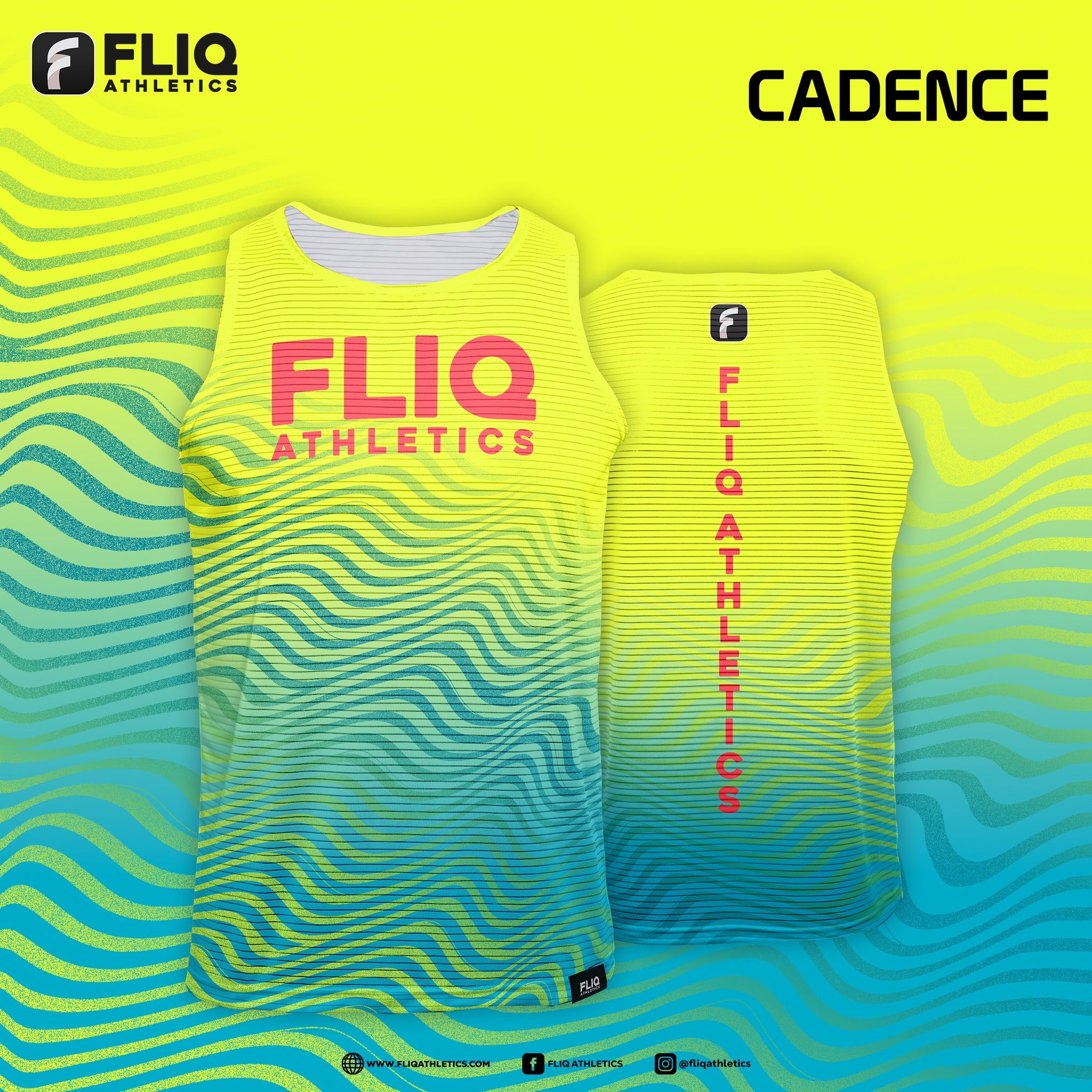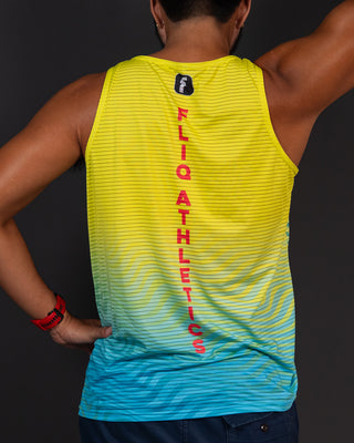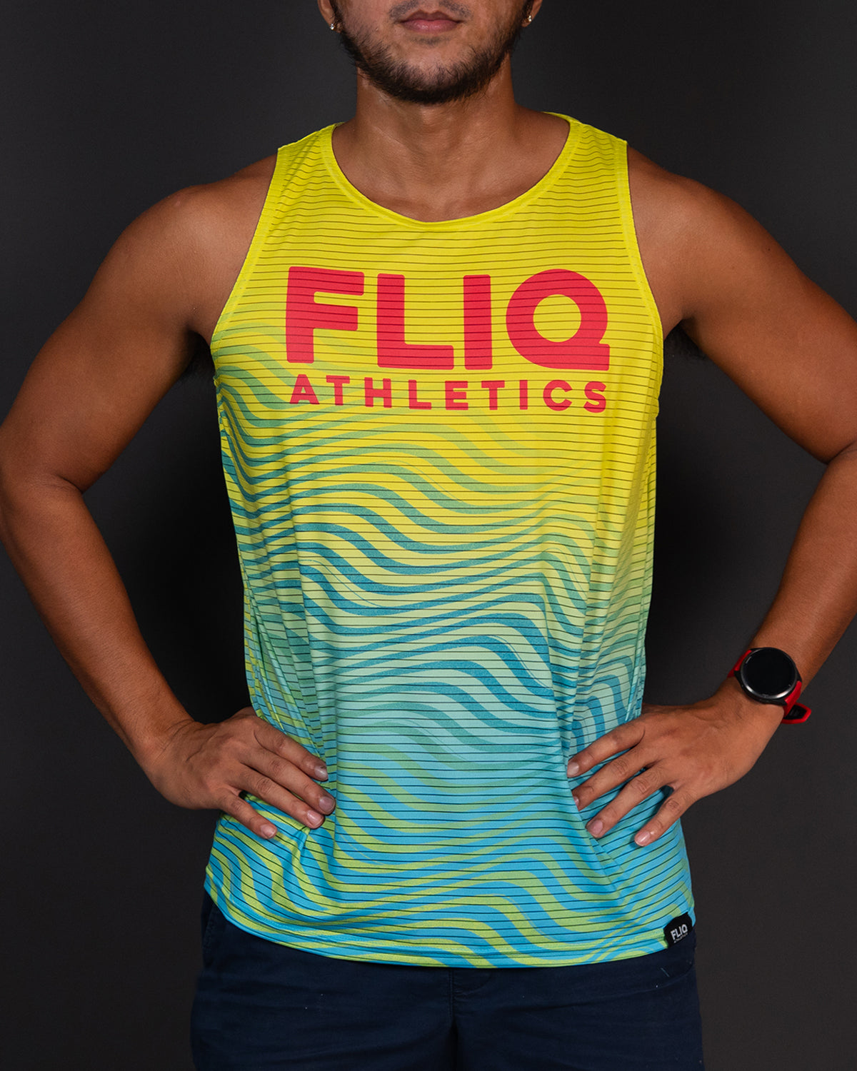This athletic tank top from Fliq Athletics is designed for a bold and dynamic look. It features a striking gradient transition from yellow at the top to blue at the bottom, with wavy horizontal lines flowing across the entire fabric, creating a sense of motion and energy.