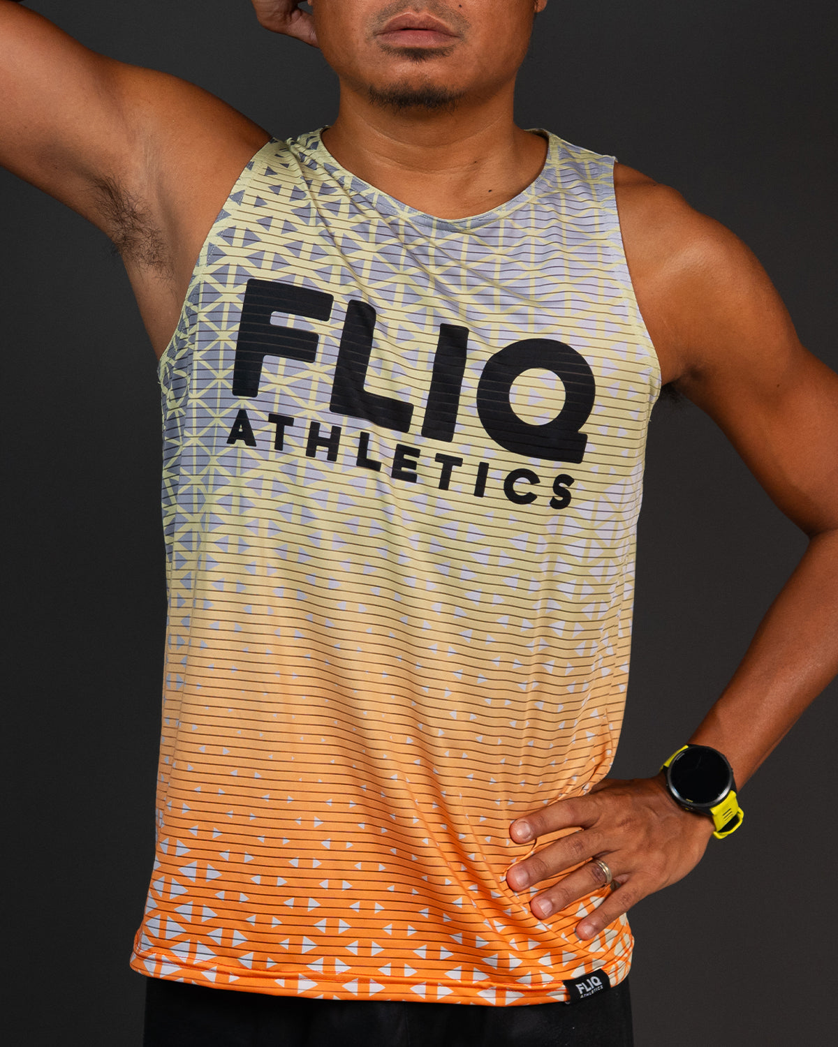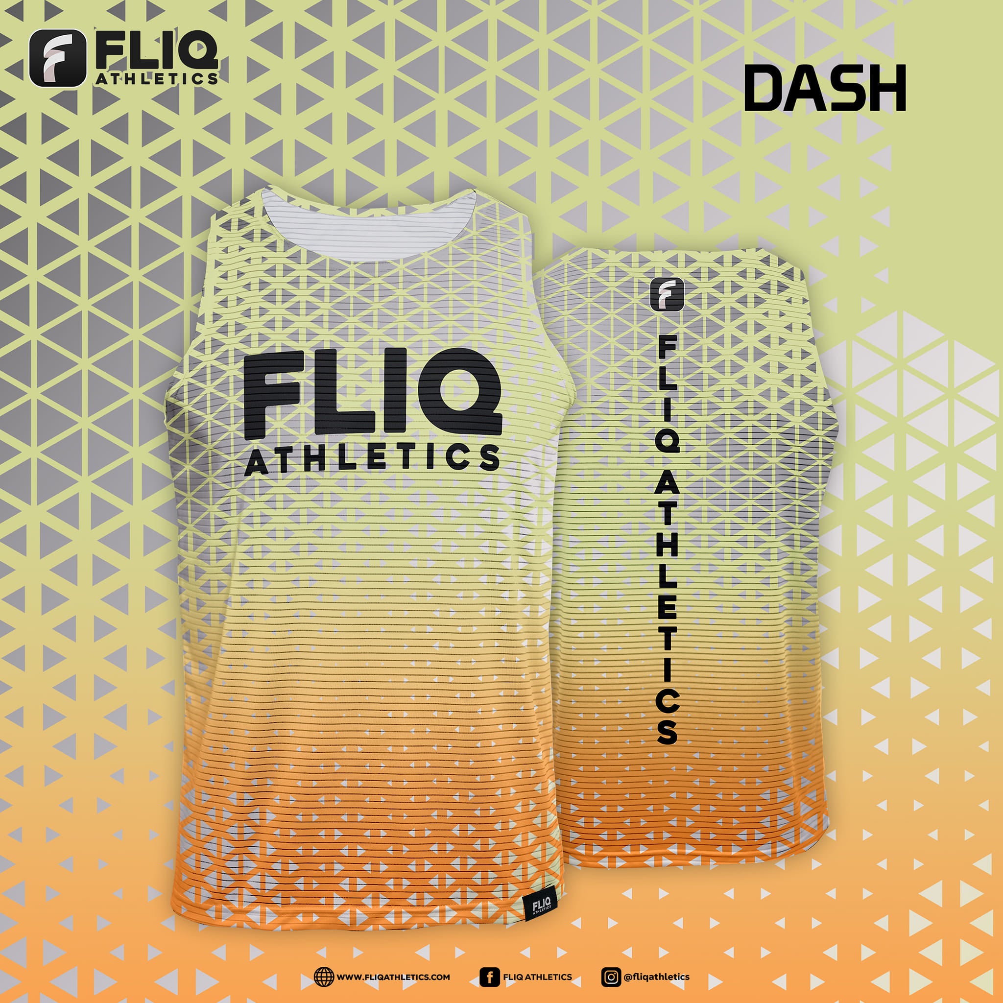 This design absolutely radiates energy! The athletic tank tops from FLIQ Athletics feature a striking gradient that transitions from a vibrant yellow at the top to a bold orange at the bottom. The horizontal lines and subtle triangular patterns add a dynamic, futuristic edge to the design.