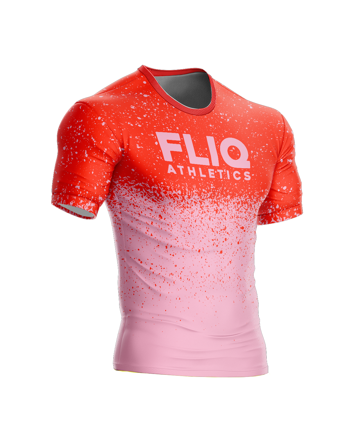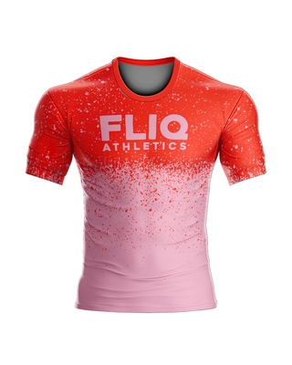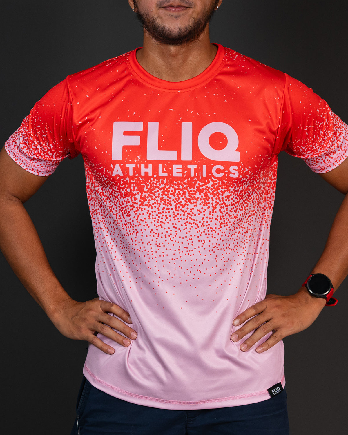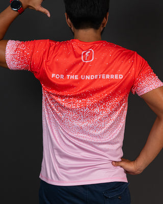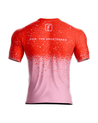 This shirt radiates confidence and energy with its fiery red-to-light pink gradient, creating a bold and striking visual impact. The white speckled pattern concentrated at the top fades as it moves downward, giving the design a dynamic and textured feel.
