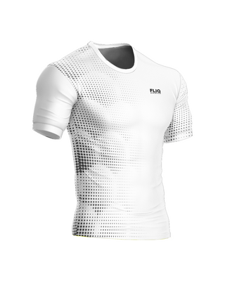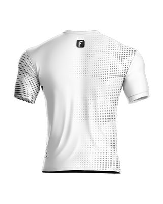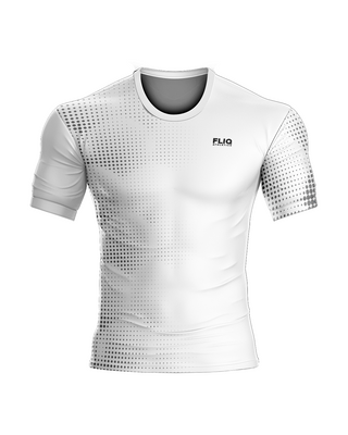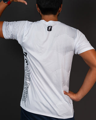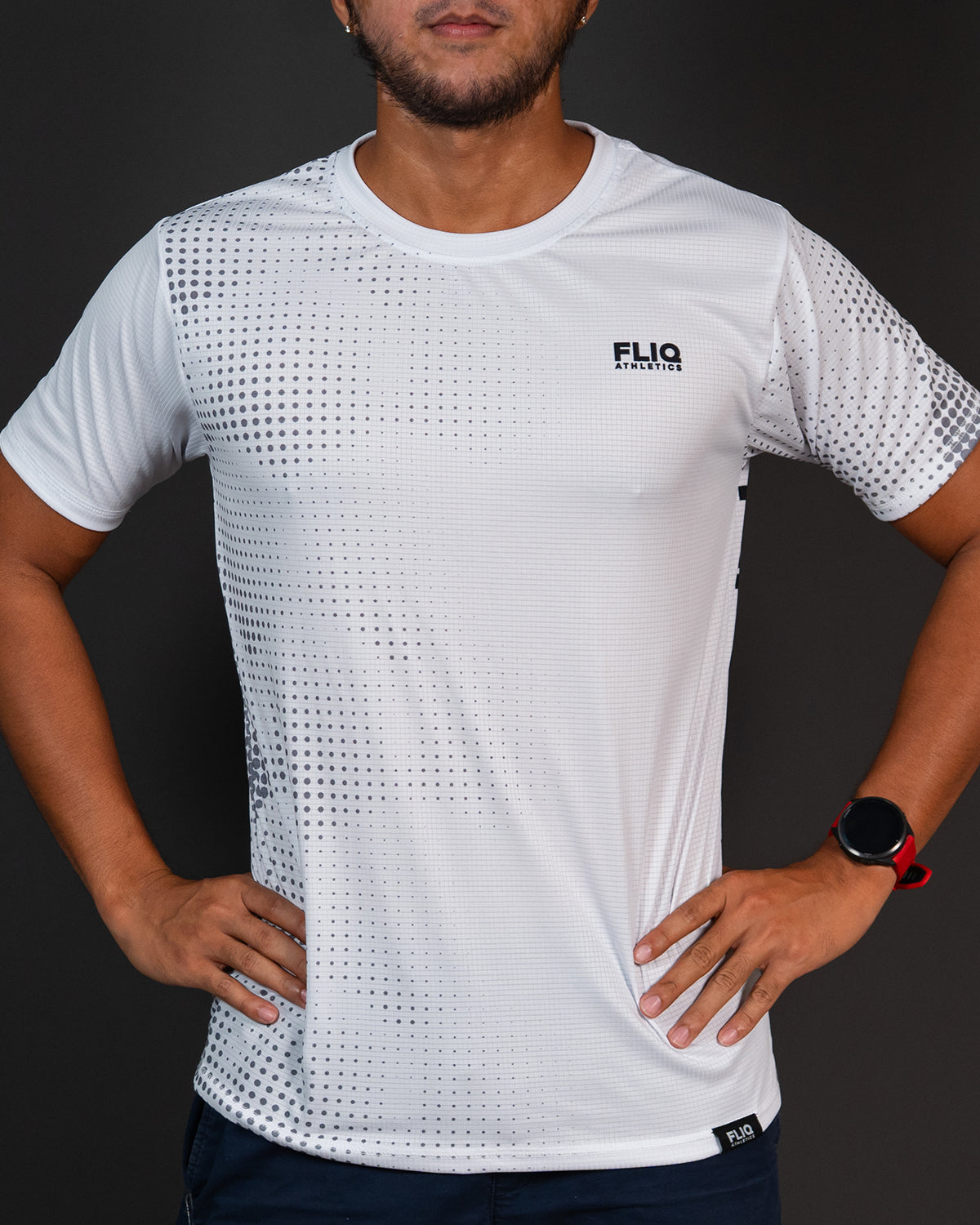 Sleek white base accented by a dotted gradient pattern, strategically placed to create a dynamic sense of movement. The black dots intensify at the top left shoulder and bottom right side, fading as they progress across the shirt, adding a subtle yet impactful design element